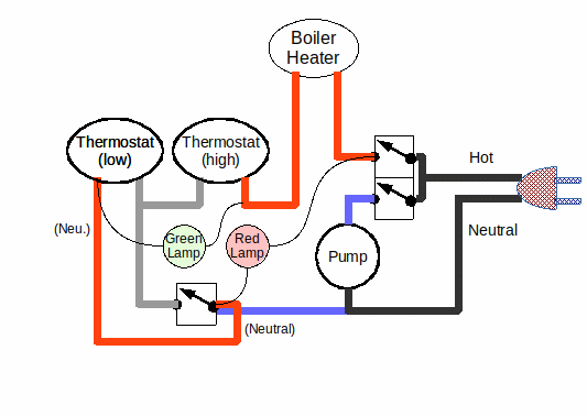 If you accidentally yank some wires loose, see the Wiring Schematic below. Otherwise the most likely result of yanking is to dislodge a thermostat. There are two, and they are held against the side of the boiler with springy metal clips. The thermostats can be recognized by the white thermal grease under them. Be certain that each thermostat's retaining clip lies in the recessed slot in the ceramic portion, where it can't touch any electrical terminals.